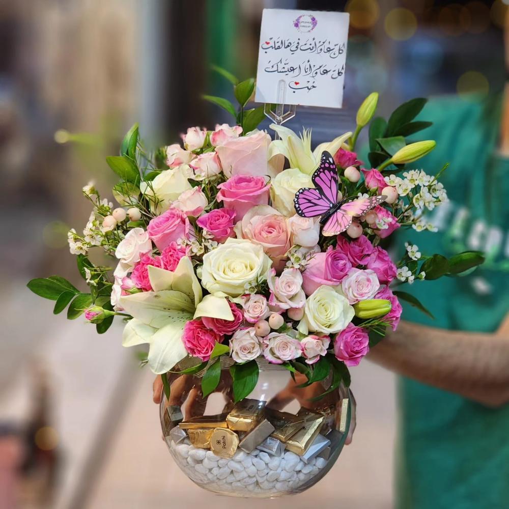 فازة زجاجية شفافة تحتوي على أحجار زينة طبيعية، مملوءة بتشكيلة رائعة من الزهور الطبيعية: جوري أبيض، بيبي روز أبيض، جوري وردي، بيبي روز وردي، بيبي روز فوشي، بيبي روز دبل كلر، وليلوم، مع خضارات زينة وفراشة زينة. يتكامل مع الشوكولاتة باتشي وكارد إهداء لتجربة فاخرة ومميزة