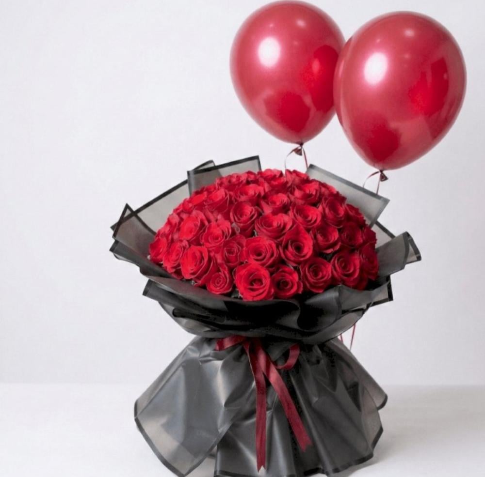 أضف لمسة أنيقة ورومانسية إلى مناسباتك مع هذه الباقة الرائعة التي تضم 50 وردة جوري. يكتمل جمال الورد بوجود بالونين احتفاليين، مما يجعلها الهدية المثالية لأعياد الميلاد أو التخرج أو أي لحظة تستحق الاحتفال