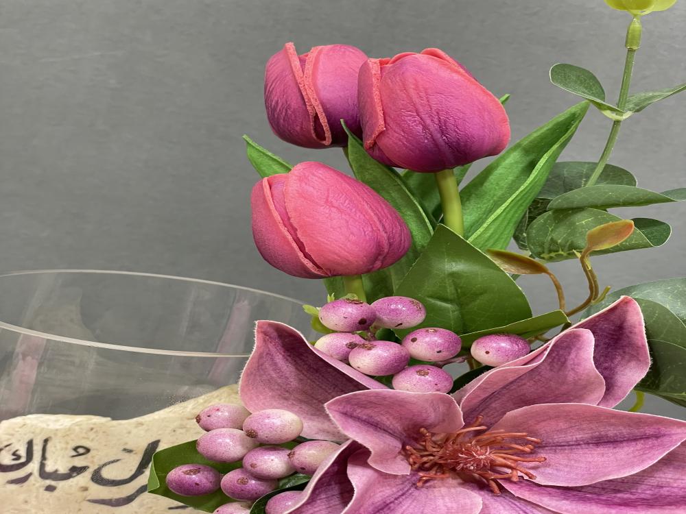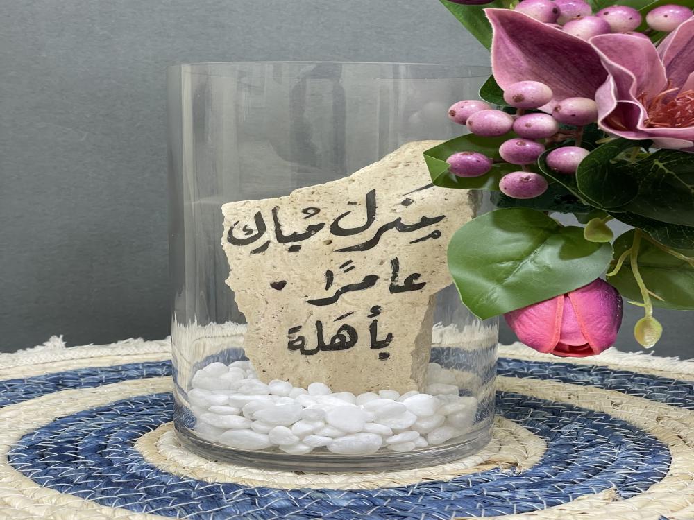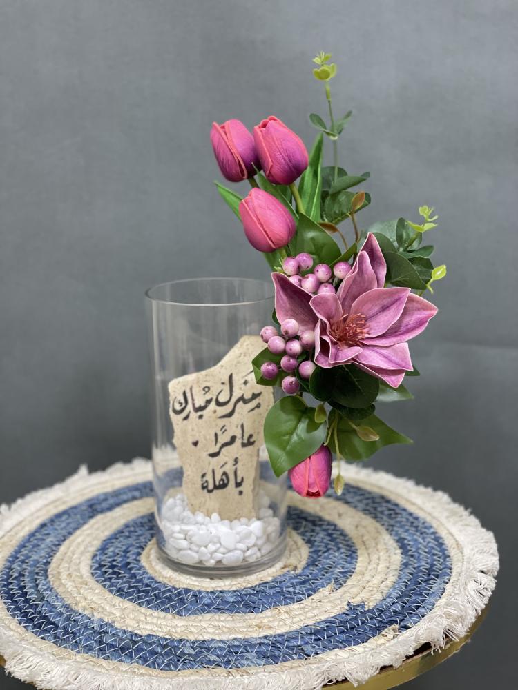 المحتوي :فازة زجاية منسقة بمجموعة من الورد الصناعي ملمس طبيعي فاخر مع قطعه من الحجر الرخام يكتب عليها اسم او عبارة حسب طلب العميل