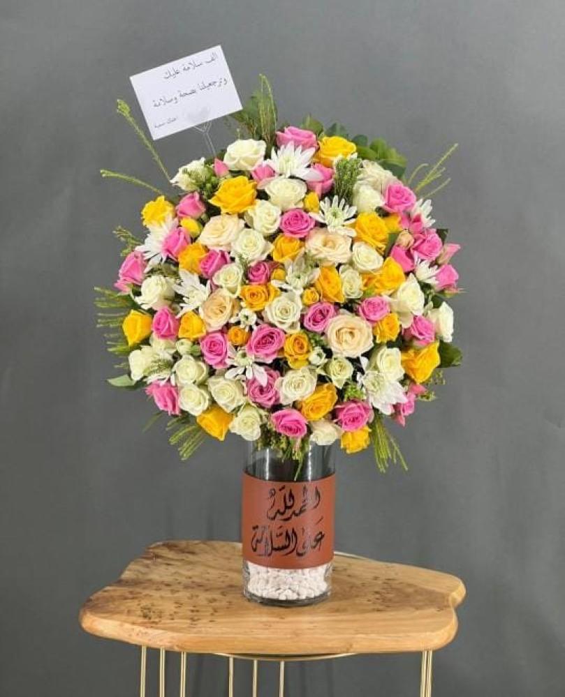 تتميز هذه الفازة الزجاجية الطويلة بجمالها الرائع، حيث تحتوي على أحجار زينة بيضاء تعزز تألق الزهور. تُنسق من الخارج بورد بيبي روز طبيعي بألوان الأبيض والأصفر والفوشي، إضافة إلى ورد الكريز الأبيض، مما يخلق تنسيقاً جذاباً ومتألقاً. قطعة الجلد المرفقة تتيح لك كتابة اسم أو عبارة مختصرة، مما يضفي طابعاً شخصياً. تتوج الفازة بخضارات مشكلة وكرت إهداء، مما يجعلها هدية مثالية تنبض بالأناقة والتفرد